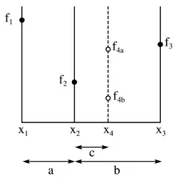 Considérons une fonction réelle ƒ. On a calculé sa valeur en trois points, x1, x2 et x3, avec x1 < x2 < x3 ; ceci est représenté sur le dessin ci-contre, avec y = ƒ(x).