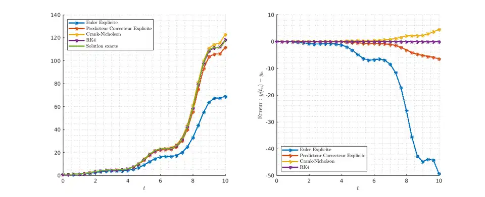 Solutions numériques de (avec ) obtenue par différentes méthodes de Runge-Kutta et comparées à la solution exacte. Le pas est . On note que l'ordre de précision de la méthode est lié à l'erreur : la méthode d'Euler Explicite a une erreur nettement plus importante que celle de RK4.