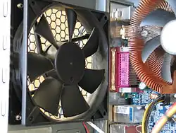 Par rapport au refroidissement passif, un ventilateur est ajouté au radiateur, formant ainsi un bloc souvent appelé ventirad ou heatsink. Le flux d'air ainsi maintenu autour du radiateur améliore le transfert thermique entre air et ailettes du radiateur par convection forcée.