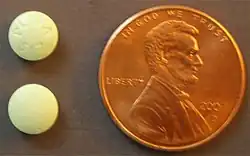 Comprimé de métoclopramide mg, avec pièce d'un cent américain pour indiquer la taille.