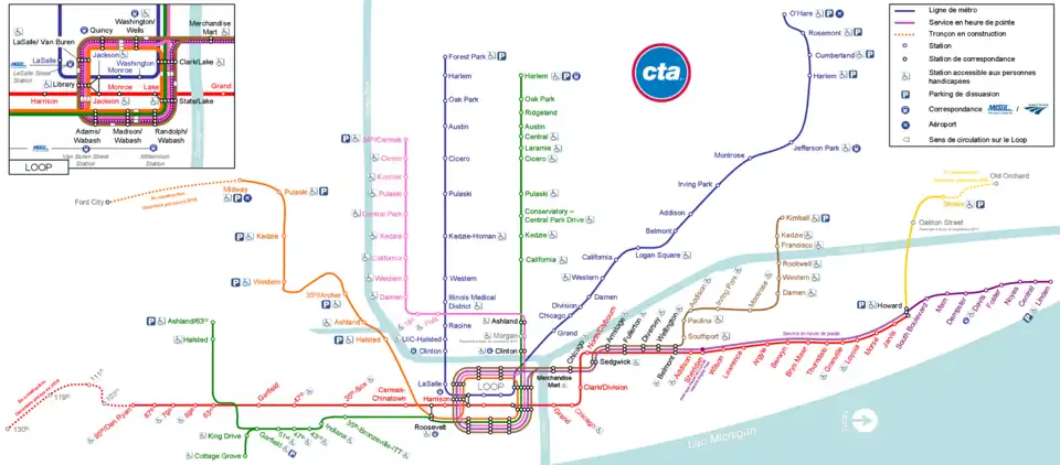 - ↑ (en) All CTA trains have accessible features, including locations inside cars where a wheelchair can be secured (consulté le 3 avril 2023)