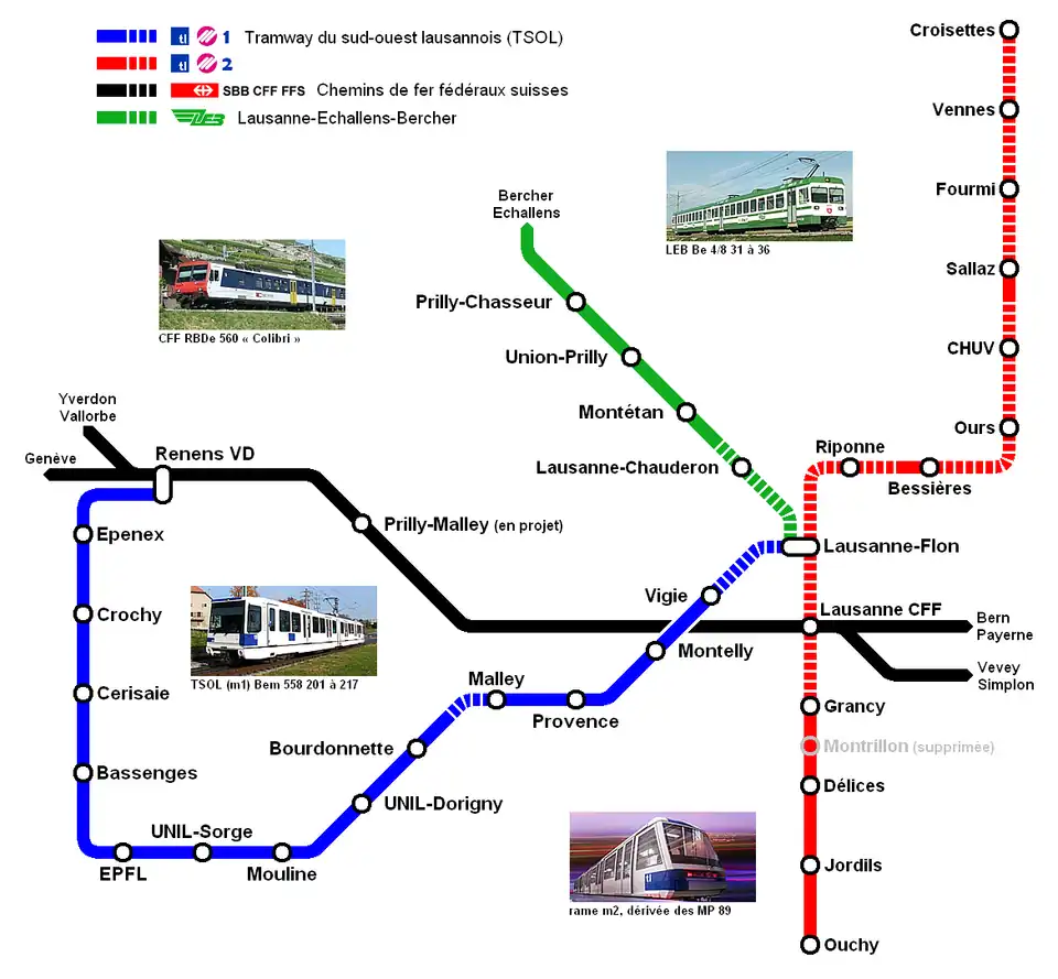 | Lausanne-Flon ↔ Renens-Gare | 1991 | 7,8 | 15 | TL Bem 4/6, TL Be 4/6 | N.C. | 22 | 13,4 | |