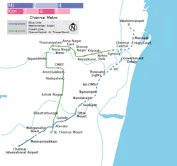 | Ligne bleue | Wimco Nagar | Aéroport international de Chennai | 32,15 km (16,6 km souterrain, 15,5 km viaduc) | 26 | ||