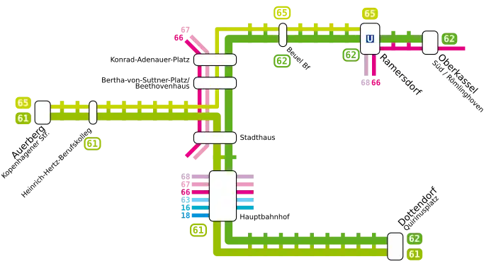 | 62 | Dottendorf – Bonn Hbf – Stadthaus – Bertha-von-Suttner-Platz – Beuel –Siebengebirgsbahn – Ramersdorf – Oberkassel | 12,0 km | 22,5 km/h |