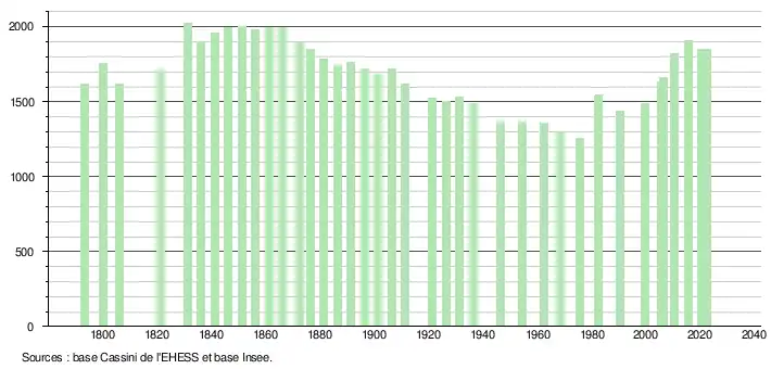 L'évolution du nombre d'habitants est connue à travers les recensements de la population effectués dans la commune depuis 1793. Pour les communes de moins de 10 000 habitants, une enquête de recensement portant sur toute la population est réalisée tous les cinq ans, les populations de référence des années intermédiaires étant quant à elles estimées par interpolation ou extrapolation[16]. Pour la commune, le premier recensement exhaustif entrant dans le cadre du nouveau dispositif a été réalisé en 2005[17].