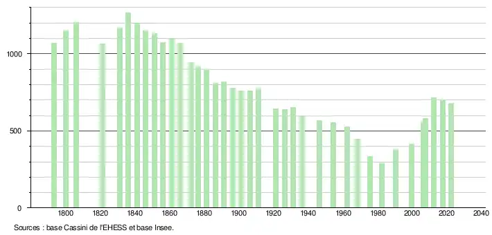 L'évolution du nombre d'habitants est connue à travers les recensements de la population effectués dans la commune depuis 1793. Pour les communes de moins de 10 000 habitants, une enquête de recensement portant sur toute la population est réalisée tous les cinq ans, les populations de référence des années intermédiaires étant quant à elles estimées par interpolation ou extrapolation[18]. Pour la commune, le premier recensement exhaustif entrant dans le cadre du nouveau dispositif a été réalisé en 2007[19].