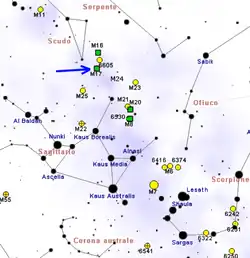 | Désignation(s) | NGC 6618 OCL 44 LBN 60 Sh2-45 RCW 160 Gum 81 HD 168520 [5] Nébuleuse du Cygne Nébuleuse du Fer à Cheval, Le Homard Nébuleuse Oméga Nébuleuse de la Coche[7] |