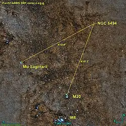 M23 est à environ 4,65 degrés de l'étoile Mu Sagittarii et à 4,4 degrés de la nébuleuse Trifide (M20).
