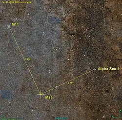 M26 et l'Amas du Canard sauvage (M11), l'un des amas les plus riches de la Voie lactée avec plus de 3000 étoiles, sont voisins sur la sphère céleste.