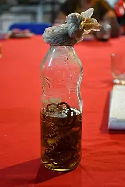 Le liquide utilisé peut être une solution alcoolique (macération alcoolique dite « alcoolature » si la plante est mise à macérer fraiche, ou teinture officinale si la plante est mise à macérer sèche). Le vin blanc[5] ou des alcools plus forts tels que rhum ou eau-de-vie ont souvent été choisi comme solvant de macération. Il peut aussi s'agir d'eau (pure ou salée) (macérât aqueux, saumure), de vinaigre, de saumure ou d'une huile végétale (macérat huileux). Ce type de macération se fait à froid où légèrement à chaud, à pression ambiante et généralement à l'abri de la lumière. Du sel est parfois ajouté afin de faciliter la perte d'eau de végétaux placés dans de l'huile, dans un bocal alors incomplètement fermé pour éviter la condensation[2]. Elle donne un « macérât » (aqueux, alcoolique ou huileux) enrichi en molécules d'intérêt (substances actives médicinales le cas échéant) qui peut être conservé et réutilisé. Par métonymie, on appelle parfois « macération » le liquide qui résulte de la macération. Cette opération s'oppose à la décoction, dans laquelle le liquide est maintenu bouillant, et à l'infusion dans laquelle le liquide est porté à ébullition puis refroidi, sans contact aussi prolongé avec l'eau que dans le cas de la macération.