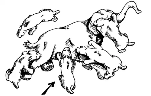 Diagramme d'un groupe de cinq Homotherium serum retenant un mammouth adolescent au sol pendant qu'un individu (marqué d'une flèche) applique la morsure de cisaillement.