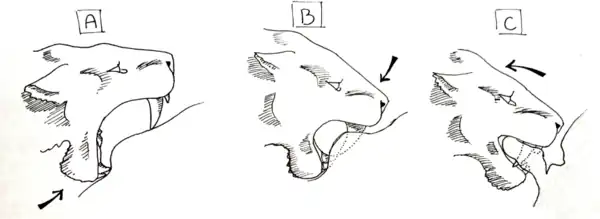 Diagramme de séquence de la morsure de cisaillement du machairodonte Homotherium serum : Le diagramme A montre le machairodonte qui presse ses canines inférieures et ses grandes incisives dans le ventre de la proie, créant un pli avec le mouvement ascendant. Le diagramme B montre le crâne rabaissé par les muscles du cou et transperce la peau. Le diagramme C montre les mâchoires serrées fermement autour de la peau et de la graisse, et avec les incisives agrippant la peau, le machairodonte le retire, arrachant le lambeau de peau du ventre.