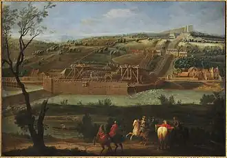 La Machine de Marly par Pierre-Denis Martin, 1723. Au premier plan, l'ile Gauthier ou île de la Machine du roi, territoire royal. On aperçoit à droite en arrière-plan, l'aqueduc de Louveciennes et sa tour du Levant dans laquelle arrivait l'eau pompée.
