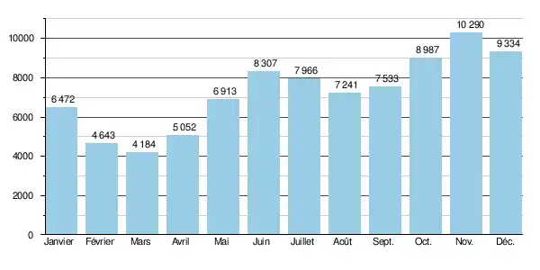 Sur la période d'observation de dix-neuf ans, le débit mensuel minimal observé a été de 1 800 m3/s, tandis que le débit mensuel maximal s'est élevé à 13 500 m3/s.