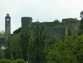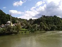 Vue de Maglaj depuis la Bosna, avec la mosquée de Jusuf-pacha (à gauche) et la forteresse (à droite)