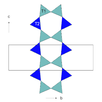 La structure de toutes les amphiboles suit une double chaîne de tétraèdres de SiO4 liés, de composition (Si4O11)n. Les tétraèdres internes sont appelés T1 et les externes sont appelés T2. Le motif de la double chaîne se répète après un bloc de deux tétraèdres T1 et deux tétraèdres T2, avec une distance de répétition d'environ 5,3 Ångström, déterminant la longueur de la cellule unitaire le long de l'axe du cristal c. Les tétraèdres d'une chaîne pointent tous vers l'extérieur dans la même direction, et les chaînes sont reliées dos à dos par des cations pour former des faisceaux en I. Les poutres en I elles-mêmes sont ensuite reliées entre elles et forment la structure complète.