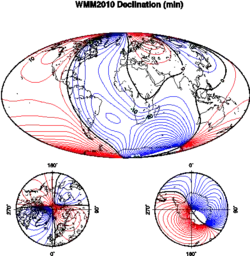 - L'angle (orienté) de la direction du pôle Nord géographique vers est appelé « déclinaison ».