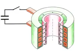 Le principe du magnétoformage utilise la force de Laplace, c'est-à-dire la force générée par un champ magnétique. Une bobine spécifique est placée près de la pièce métallique à transformer, à la place du poussoir traditionnel de formage. Une énorme impulsion de courant est envoyée à la bobine en déchargeant rapidement une batterie de condensateurs haute tension à l'aide d'un ignitron ou d'un éclateur, comme un interrupteur. Cela crée un champ électromagnétique ultra puissant (par le biais de l'induction électromagnétique), oscillant rapidement autour de la bobine de travail.