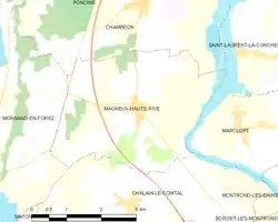 Magneux-Haute-Rive est au centre de la plaine du Forez, entre sa sous-préfecture Montbrison (13 km au sud-ouest) et Feurs (10 km au nord-est)[2], à 10 km de la rive gauche (côté ouest) de la Loire[3]. Montrond-les-Bains est à 7 km au sud-ouest (en rive droite de la Loire), la préfecture Saint-Étienne est à 35 km au sud-ouest (par l'autoroute) ; Lyon à 72 km à l'ouest[2].