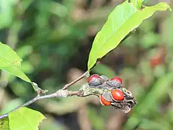 Ces magnolias donnent des fruits d'environ 5 cm de long qui s'ouvrent en début d'automne. Le fruit mûr s'ouvre par des fentes pour révéler des graines rouge-orange, mais les fruits tombent souvent avant de se développer pleinement.