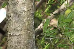 Les jeunes rameaux ont une écorce brune, tandis que le troncs a une écorce lisse gris argenté.