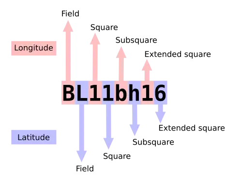 Par exemple, la tour Eiffel, qui se trouve en longitude 2.2946 est (2° 17' 40" E), latitude 48.8587 nord (48° 51' 31" N) est localisée en JN18du. La longitude est 'J':(10*20)-180 + '1':1*2 (2 degrés est) + 'd':3*5' (15 minutes d'arc); la latitude est 'N':(13*10)-90 + '8':8 (48 degrés nord) + 'u':20*2,5 (50 minutes d'arc) (à vérifier).