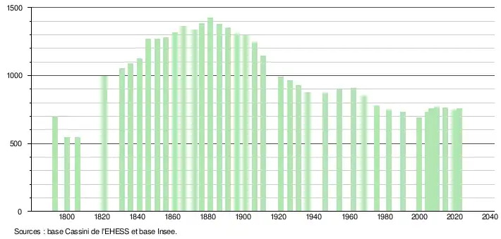 L'évolution du nombre d'habitants est connue à travers les recensements de la population effectués dans la commune depuis 1793. Pour les communes de moins de 10 000 habitants, une enquête de recensement portant sur toute la population est réalisée tous les cinq ans, les populations de référence des années intermédiaires étant quant à elles estimées par interpolation ou extrapolation[16]. Pour la commune, le premier recensement exhaustif entrant dans le cadre du nouveau dispositif a été réalisé en 2004[17].