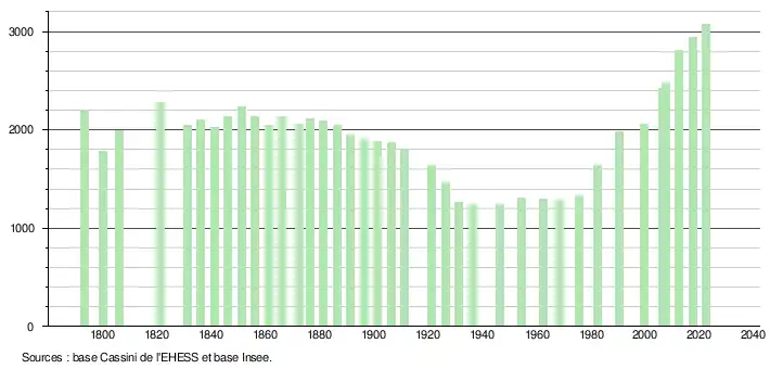 L'évolution du nombre d'habitants est connue à travers les recensements de la population effectués dans la commune depuis 1793. Pour les communes de moins de 10 000 habitants, une enquête de recensement portant sur toute la population est réalisée tous les cinq ans, les populations de référence des années intermédiaires étant quant à elles estimées par interpolation ou extrapolation[23]. Pour la commune, le premier recensement exhaustif entrant dans le cadre du nouveau dispositif a été réalisé en 2007[24].