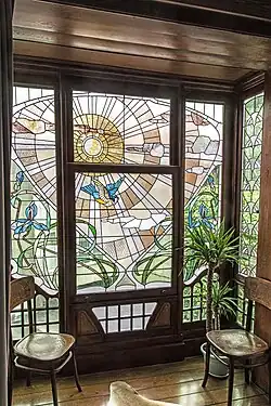 La fenêtre de cave grillagée (ferronnerie en éventail aux motifs végétaux) forme un arc outrepassé. La porte d'entrée en bois est ornée de vitraux reprenant des motifs végétaux stylisés sur les deux tiers supérieurs. Des vitraux occupent aussi la baie d'imposte. Un sgraffite à dessin végétal (dégradé en ) est placé au-dessus de cette baie d'imposte. Sur la travée de gauche, le bow-window présente une menuiserie ouvragée formant dans le bas des lignes courbes et des carreaux et utilisant des vitraux polychromes sur la partie principale. Un petit garde-fou en bois coiffe ce bow-window. La corniche, entrecoupée d'une baie rectangulaire, repose sur d'imposants modillons en biais doublés de traverses courbes.