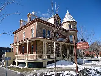 Le toit, à croupe à quatre versants, est recouvert de tôles à la canadienne avec une tourelle de forme conique à l'angle nord-est. La lucarne principale comporte une fenêtre palladienne, colonnettes et ornements, surmontée d'un fronton circulaire. Les autres lucarnes ont des toits cintrés, les corniches avec de petites consoles décoratives et des frises moulurées. Le larmier est décoré de modillons à volutes. Les fenêtres à guillotines sont hautes et étroites[3].