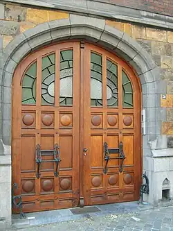 Parmi les éléments les plus significatifs de cette demeure, la porte d'entrée, en réalité une splendide porte cochère à deux battants en bois sculpté de sphères et de rectangles, laisse la place dans sa partie supérieure à des vitraux américains sous un arc légèrement brisé. Des boîtes aux lettres en fer forgé très ouvragé ornent cette porte et, au sol, deux sympathiques petits monstres s'appuient sur chaque pied-droit. On retrouve ces petits monstres faisant fonction d'ancres de façade sur la maison Moonen réalisée un an plus tard par Victor Rogister.