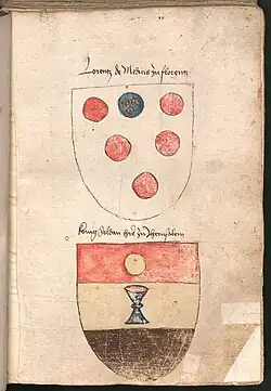- La signification des armes est incertaine d'autant plus que la forme de l'écu et le nombre de boules évolue (de onze initialement à six) à mesure que la famille s'enrichit[9] :
