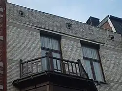 Au-dessus de ce toit, les mêmes poutres précèdent des vitraux et servent de support à l'oriel. L'oriel en bois sombre dont la base est finement sculptée en forme de denticules se compose de trois baies composées de vitres surmontées de vitraux. Un balcon en bois couronne l'oriel par des motifs géométriques réguliers.