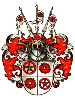 Le blason antérieur à ce mariage avec Cunigund von Stromede présente sur un plein blanc de gueule la roue rouge à cinq branches porté par le même lambrequin orné d'un même heaume de profil tourné vers la gauche.