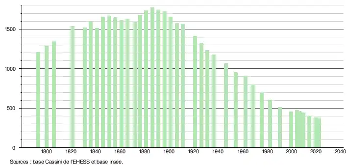 L'évolution du nombre d'habitants est connue à travers les recensements de la population effectués dans la commune depuis 1793. Pour les communes de moins de 10 000 habitants, une enquête de recensement portant sur toute la population est réalisée tous les cinq ans, les populations de référence des années intermédiaires étant quant à elles estimées par interpolation ou extrapolation[21]. Pour la commune, le premier recensement exhaustif entrant dans le cadre du nouveau dispositif a été réalisé en 2004[22].