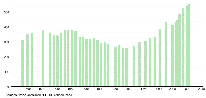 L'évolution du nombre d'habitants est connue à travers les recensements de la population effectués dans la commune depuis 1793. Pour les communes de moins de 10 000 habitants, une enquête de recensement portant sur toute la population est réalisée tous les cinq ans, les populations de référence des années intermédiaires étant quant à elles estimées par interpolation ou extrapolation[22]. Pour la commune, le premier recensement exhaustif entrant dans le cadre du nouveau dispositif a été réalisé en 2004[23].
