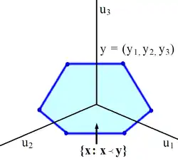 La figure 1 montre l'enveloppe convexe, en bleu, pour le vecteur y = (3, 1) ; c'est le segment de droite joignant (3, 1) à (1, 3). Parmi tous les vecteurs x sur ce segment, celui pour lequel la première composante de est la plus petite est le vecteur x = (2, 2). La figure 2 montre une enveloppe convexe en 3D, qui est ici un polygone plan. Son centre est le « plus petit » vecteur x tel que .