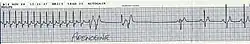 - en première intention : adénosine triphosphate[16] en intraveineuse rapide. Ce dernier, déprimant fortement et transitoirement la conduction atrioventriculaire, permet de faire le diagnostic de ce type de tachycardie s'il parvient à régulariser le cœur. Elle doit être administrée sous surveillance électrocardiographique.