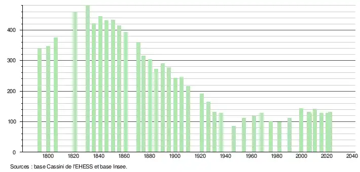 L'évolution du nombre d'habitants est connue à travers les recensements de la population effectués dans la commune depuis 1793. Pour les communes de moins de 10 000 habitants, une enquête de recensement portant sur toute la population est réalisée tous les cinq ans, les populations de référence des années intermédiaires étant quant à elles estimées par interpolation ou extrapolation[15]. Pour la commune, le premier recensement exhaustif entrant dans le cadre du nouveau dispositif a été réalisé en 2005[16].