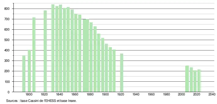 L'évolution du nombre d'habitants est connue à travers les recensements de la population effectués dans la commune depuis 1793. Pour les communes de moins de 10 000 habitants, une enquête de recensement portant sur toute la population est réalisée tous les cinq ans, les populations de référence des années intermédiaires étant quant à elles estimées par interpolation ou extrapolation[13]. Pour la commune, le premier recensement exhaustif entrant dans le cadre du nouveau dispositif a été réalisé en 2007[14].