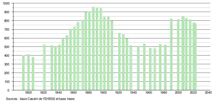 L'évolution du nombre d'habitants est connue à travers les recensements de la population effectués dans la commune depuis 1793. Pour les communes de moins de 10 000 habitants, une enquête de recensement portant sur toute la population est réalisée tous les cinq ans, les populations de référence des années intermédiaires étant quant à elles estimées par interpolation ou extrapolation[22]. Pour la commune, le premier recensement exhaustif entrant dans le cadre du nouveau dispositif a été réalisé en 2005[23].