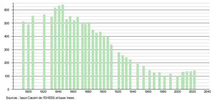L'évolution du nombre d'habitants est connue à travers les recensements de la population effectués dans la commune depuis 1793. Pour les communes de moins de 10 000 habitants, une enquête de recensement portant sur toute la population est réalisée tous les cinq ans, les populations de référence des années intermédiaires étant quant à elles estimées par interpolation ou extrapolation[20]. Pour la commune, le premier recensement exhaustif entrant dans le cadre du nouveau dispositif a été réalisé en 2007[21].
