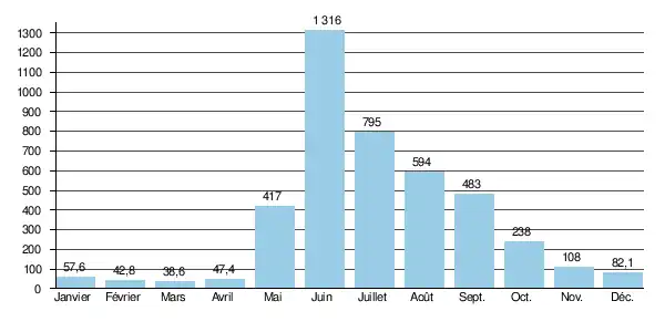 En ce qui concerne la période estivale, la seule utile car libre de glaces (de juin à septembre inclus), le débit mensuel minimum observé a été de 278 m3/s en .