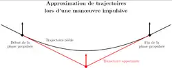 Bien qu’étant physiquement impossible due au caractère instantanée de l’impulsion, cette modélisation théorique décrit très bien les effets sur la trajectoire du véhicule spatial considéré. L’erreur de trajectoire, illustrée sur la figure ci-contre, est faible et suffisamment localisée pour être négligée à l’échelle de la trajectoire globale.