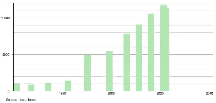 - ↑ Par convention dans Wikipédia, le principe a été retenu de n’afficher dans le tableau des recensements et le graphique, pour les populations de référence postérieures à 1999, que les populations correspondant à une enquête exhaustive de recensement pour les communes de moins de 10 000 habitants, et que les populations des années 2006, 2011, 2016, etc. pour les communes de plus de 10 000 habitants, ainsi que la dernière population de référence publiée par l’Insee pour l'ensemble des communes.