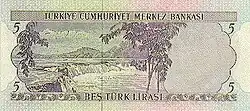 Les chutes d'eau du fleuve Manavgat représentées sur le billet de 5 livres des années (1968-1983).