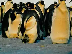 Étant donné que la terre est couverte de glace, le Manchot empereur ne nidifie pas, mais il porte l'œuf sur ses pattes, hautement vascularisées, et le recouvre d'un épais repli de peau (la température sous le repli est estimée à plus de 30 °C) : l’œuf évite ainsi tout contact avec la glace[45]. Au moment de la ponte, la femelle rabat sa queue sous elle pour réceptionner l'œuf, puis le dépose sur ses pattes et va à tout petits pas vers le mâle pour le lui présenter. Les réserves pondérales de la femelle sont alors épuisées, et elle doit donner avec précaution son œuf au mâle avant de se diriger vers l'océan où elle va se nourrir durant deux mois[46],[39]. Le transfert de l'œuf peut se révéler compliqué, et de nombreux couples le font tomber durant cette opération. Quand cela arrive, l'embryon est rapidement perdu, car l'œuf ne peut résister aux températures extrêmement basses du sol glacé. Le mâle passe l'hiver à couver l'œuf sous son repli de peau, le balançant sur la pointe de ses pattes, durant 64 jours consécutifs jusqu'à l'éclosion[41]. Le Manchot empereur est la seule espèce de manchot où le mâle couve l'œuf seul. Lorsque l'œuf éclot, le mâle a jeûné pendant environ 115 jours depuis son arrivée dans la colonie[41]. Pour survivre au froid et aux vents de parfois plus de 200 km/h, les mâles se regroupent et se tiennent les uns contre les autres, comme une forme de tortue, en se relayant afin de ne pas être toujours exposés sur les bords de la formation. Durant tout le temps du voyage, de la cour et de la couvaison, le mâle perd 10 à 15 kg, soit 30 à 45 % de sa masse initiale qui varie entre 34 et 40 kg[47].