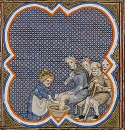 « Derechief en chascun le jeusdi assolu li sainz Roi lavoit les piez à treize poures ou à vingt six, et donoit à chascun d'eus quarante deniers, et après il les servoit en sa persone à table, einsi com il est devisé pardesus que il fesoit aus autres poures; et ce méesme fesoit-il fere par Monseigneur Phelipe et par Monseigneur Pierres, et par ses autres enfanz, quant il estoient avecques lui eu jour du juesdi ; et aucuns de ses chapelains disoient l'Office du mandé endemeutières que il lavoit les piez as poures. »