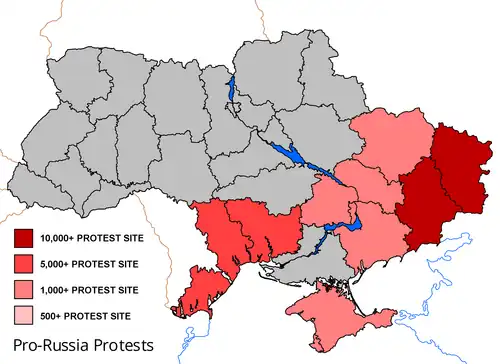 Le , des manifestations pro-russes ont lieu dans les villes industrielles de l'est de l'Ukraine alors que la Crimée vote le même jour son rattachement à la Russie. À Donetsk, des manifestants pénètrent aux sièges du parquet et des services spéciaux, à l'issue d'une manifestation de deux mille personnes en faveur du rattachement à la Russie. À Kharkiv, ce sont six mille manifestants qui organisent, et ce malgré l'interdiction de la justice, un meeting-référendum pour plus d'autonomie et pour la « souveraineté » de la langue russe. Des milliers d'entre eux marchent ensuite vers les bureaux d'organisations nationalistes où ils brûlent drapeaux, livres et tracts devant l'entrée. Les partisans de Kiev décident de leur côté d'annuler leur manifestation afin d'éviter des provocations après qu'une personne a été poignardée à mort à Donetsk le et que deux personnes ont été tuées dans la nuit du 14 au à Kharkiv, au cours d'une fusillade impliquant nationalistes radicaux et militants pro-russes[22],[23]. Le , la diffusion de quatre grandes chaînes de télévision russes est interdite en Ukraine en raison de « mauvaise représentation des faits »[24].