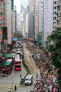La participation de la manifestation dépassa les prévisions de la police. Initialement, la police réserva les voies de direction ouest seulement pour les manifestants, ce qui n'a pas suffi. Les manifestants demandèrent d'ouvrir les voies de circulation restantes pour faciliter la manifestation. À cause de la circulation lente et de la participation massive, la manifestation s'étendit aussi dans la direction opposée jusqu'à la rue Tin-Chong au Point-Nord, à l'Est de départ de la manifestation[42] tandis que la marche se dirigeait vers l'Ouest. La police ouvrit finalement les voies de circulations restantes et le chemin Hennessey fut rempli par les manifestants.